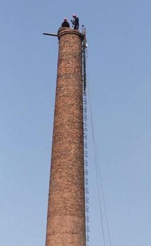 (2)在進行煙囪人工簡體拆除施工時要先從煙囪頂部向下拆除,首先用專業拆除工具在煙囪筒壁磚塊開口,即用手錘或專用拆除電鎬將墻壁開口后,再用手錘改成小塊,再向煙囪外壁或內壁往下放,由上而下慢慢進行人工拆除。因高空拆除下來的磚塊易飛濺墜落,在拆除時煙囪下面必須要有專人看護,在施工范圍內不得有非施工作業人員進入,登高操作人員都要配戴保險,都保在煙囪爬梯或牢固可靠的部位上扣牢,確保人員的安全。
